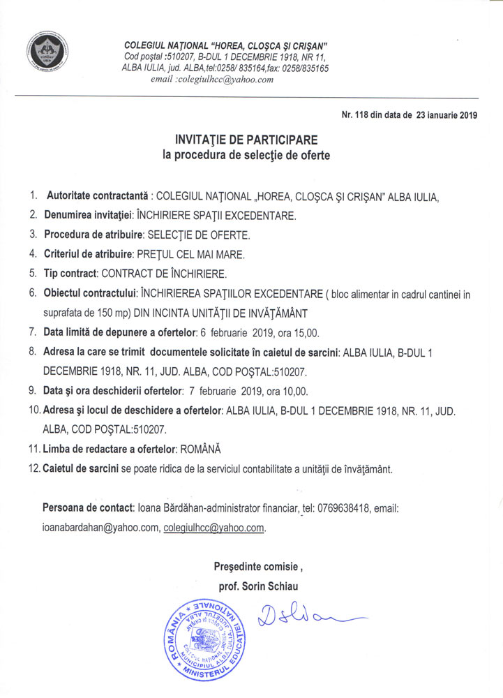 COLEGIUL NAȚIONAL „HOREA CLOȘCA ȘI CRIȘAN” ALBA IULIA ANUNȚĂ CONCURS PENTRU OCUPAREA POSTULUI DE SECRETAR ȘCOALA (0,5 NORMĂ)